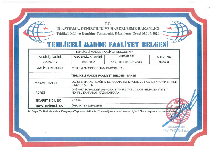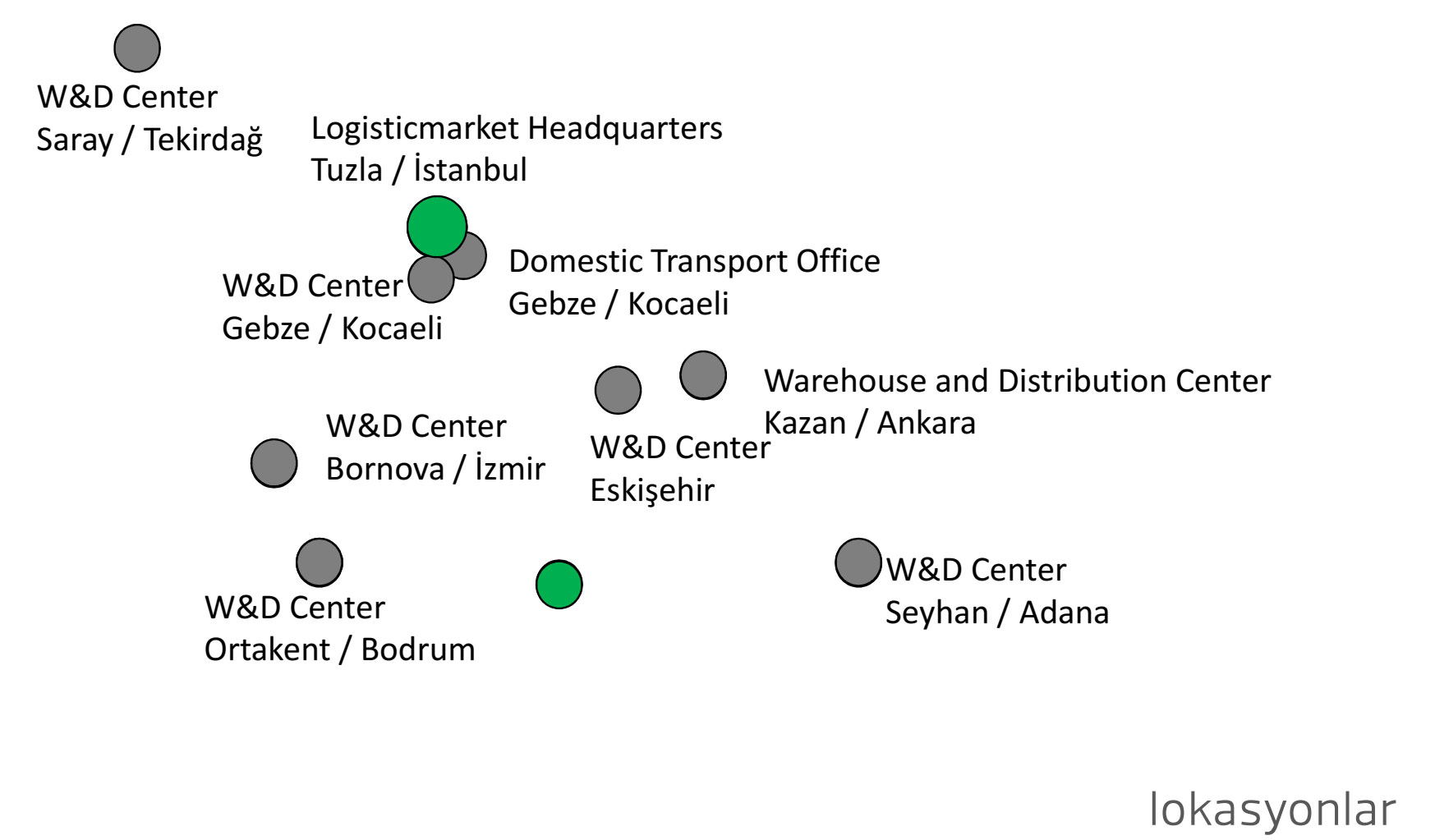 Lojistik Market'in, lojistik hizmetleri kapsamında Marmara, Ege, Akdeniz, İç Anadolu ve Güneydoğu Anadolu bölgelerinde taşımacılık, depolama ve mikro dağıtım, yurtiçi taşıma, proje taşımacılığı, limanlarda konteyner taşımacılığı operasyonlarının yanı sıra demiryolu, denizyolu ve havayolu taşımacılığında forwarding hizmetleri sunmaktadır.